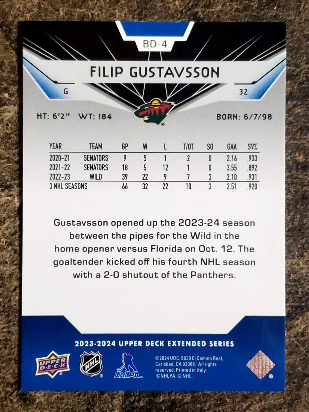 Filip Gustavsson 2023-24 Black Diamond #Bd-4