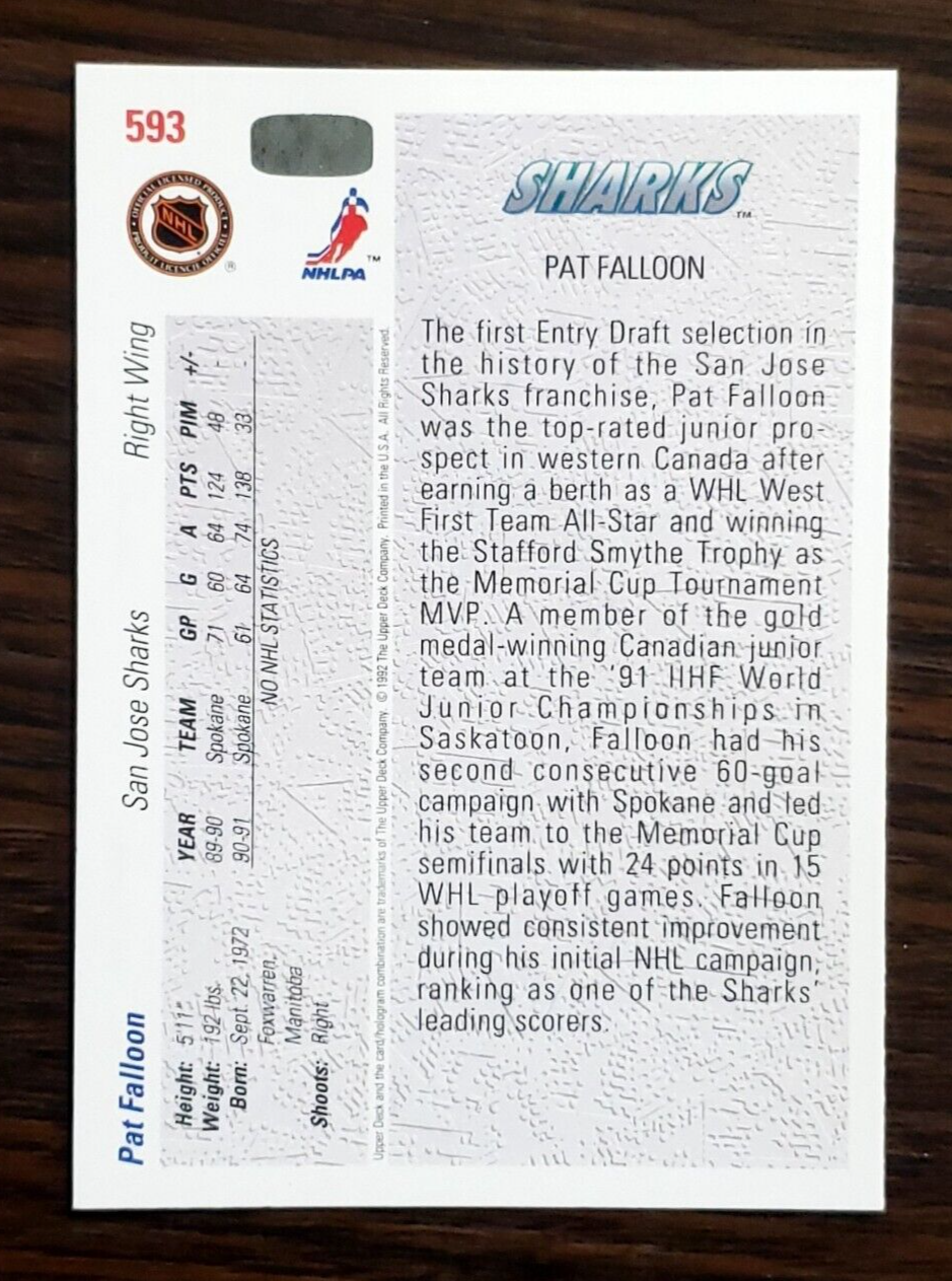 Pat Falloon 1991-92 Upper Deck Young Guns Rookie Card #593